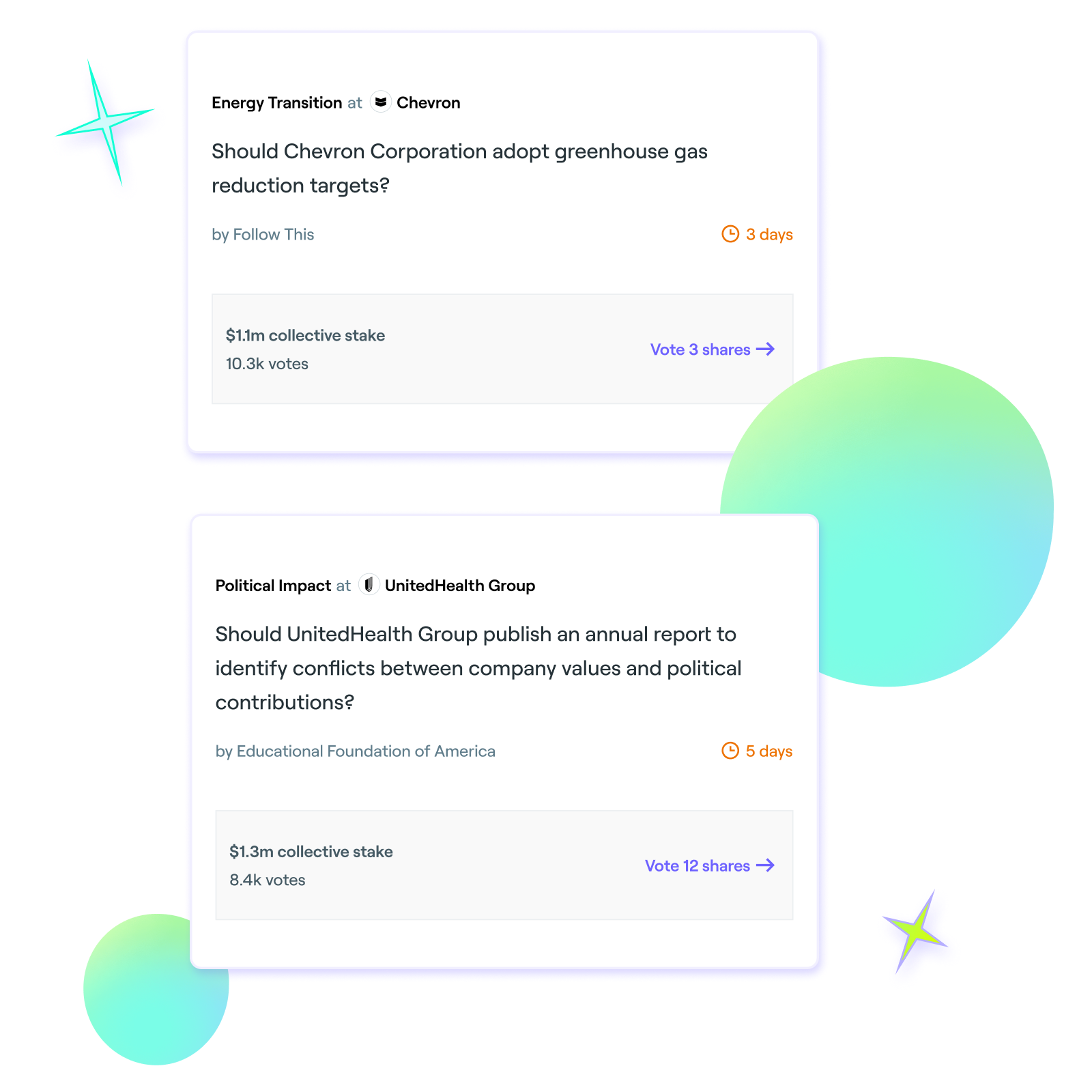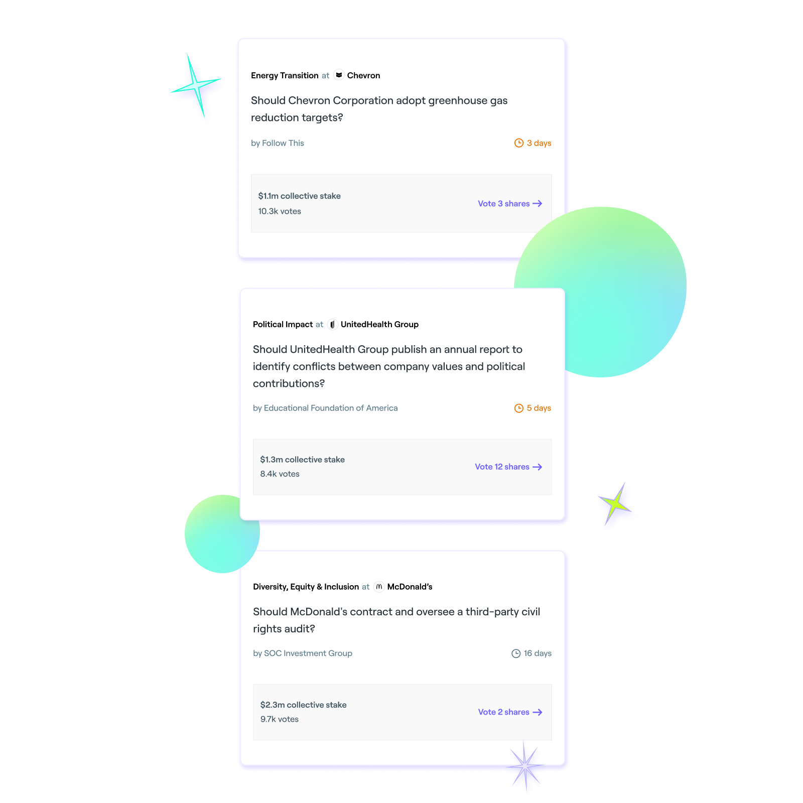 We’ll be building out a suite of tools to help everyday investors become shareholder activists, making the most out of the portfolio of shares you already own. A sneak peak at some of the features we’re working on include:
